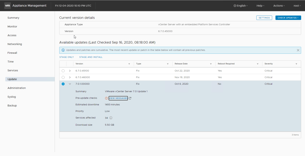 That’s right! A vCenter 6.7 system being presented a 7.0 update, it’s worth highlighting if you want proof you can’t patch to 7.0 from 6.7 this way, run the pre-update checks, it’ll tell you that this isn’t compatible. Don’t try it if you don’t want a bad day, it shouldn’t let you proceed but the fact it’s passed the compatibility matrix to be presented in the first place is a concern.