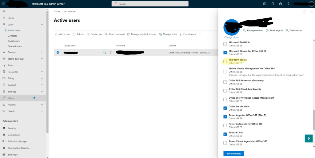 To do this, navigate to https://admin.microsoft.com, browse your active users and find the active user, then click on them, navigate to “Licenses and apps”, then under the app section you can disable specific services. I disabled Microsoft Teams, Phone System, Audio Conferencing and Skype for Business Online Plan 2. This is because we don’t want any dependencies of Microsoft Teams to remain as this could complicate the setup.