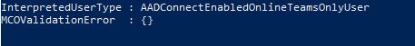 Get-CsOnlineUser "User name" | fl userprincipalname, sipaddress, sipproxyaddress, email, proxyaddresses, windowsemailaddress, interpretedusertype, mcovalidationerror
