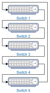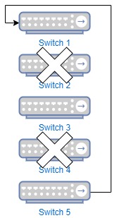In this scenario, switch 2 & 4 are temporarily in a failed state, switch 1 and 5 can talk to each other, but as switch 3 has no surviving connections to the rest of the stack, it is isolated. To mitigate this, it would be required to wait for one of the switches to complete its update before updating the other switch.