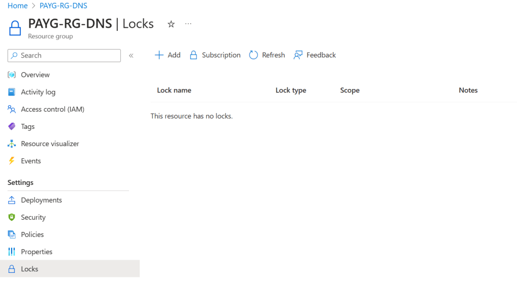 The only difference when working with subscriptions is that you navigate to ‘Settings > Resource locks’.