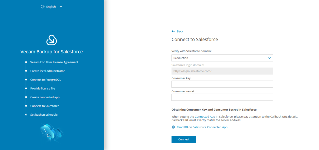 After creating the App, export the credentials via “Manage Consumer Details” and enter them in Veeam setup. Afterwards you’ll get redirected to Salesforce and need to login and approve the access.