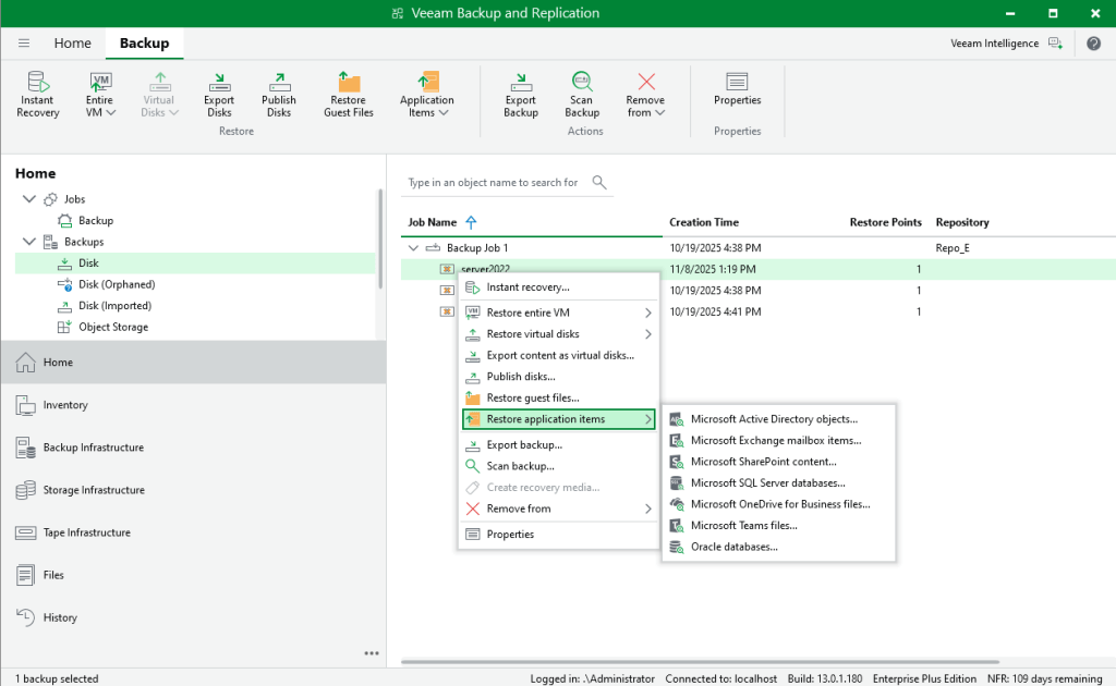 backups; application-item recovery by Veeam Explorers for Microsoft Active Directory, Microsoft Exchange