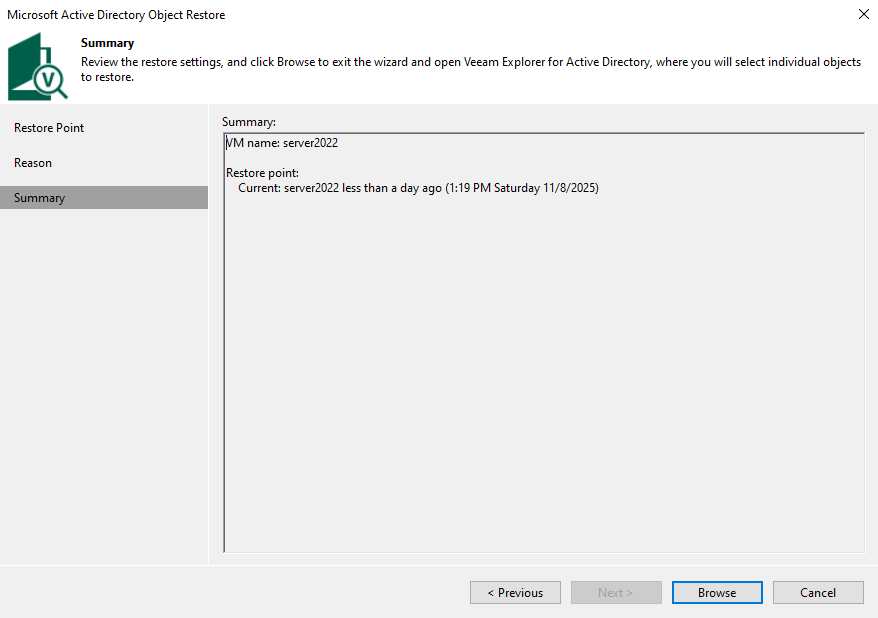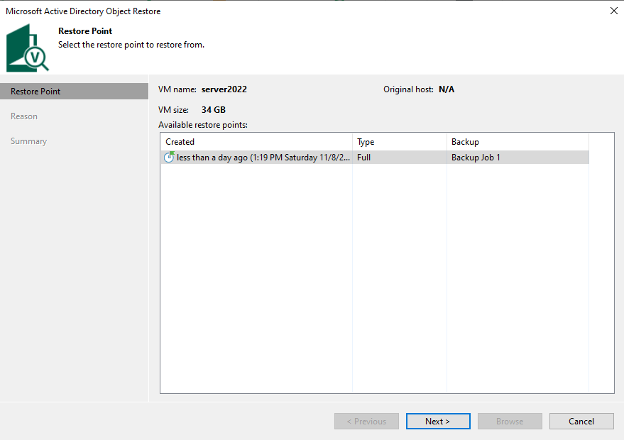 I went for Microsoft Active Directory objects, selected the new restore point and was able to browse my Active Directory.