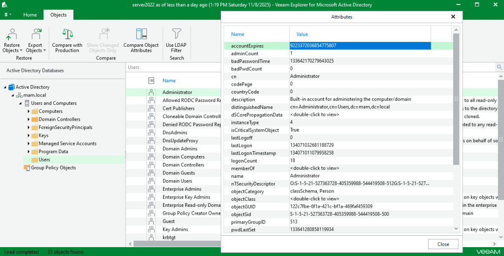 As in my previous tests, I was running a Domain Controller in my Proxmox lab environment. Therefore I configured guest processing for this VM, created another backup and checked the available options. As expected I was now seeing the tab “Restore application items”